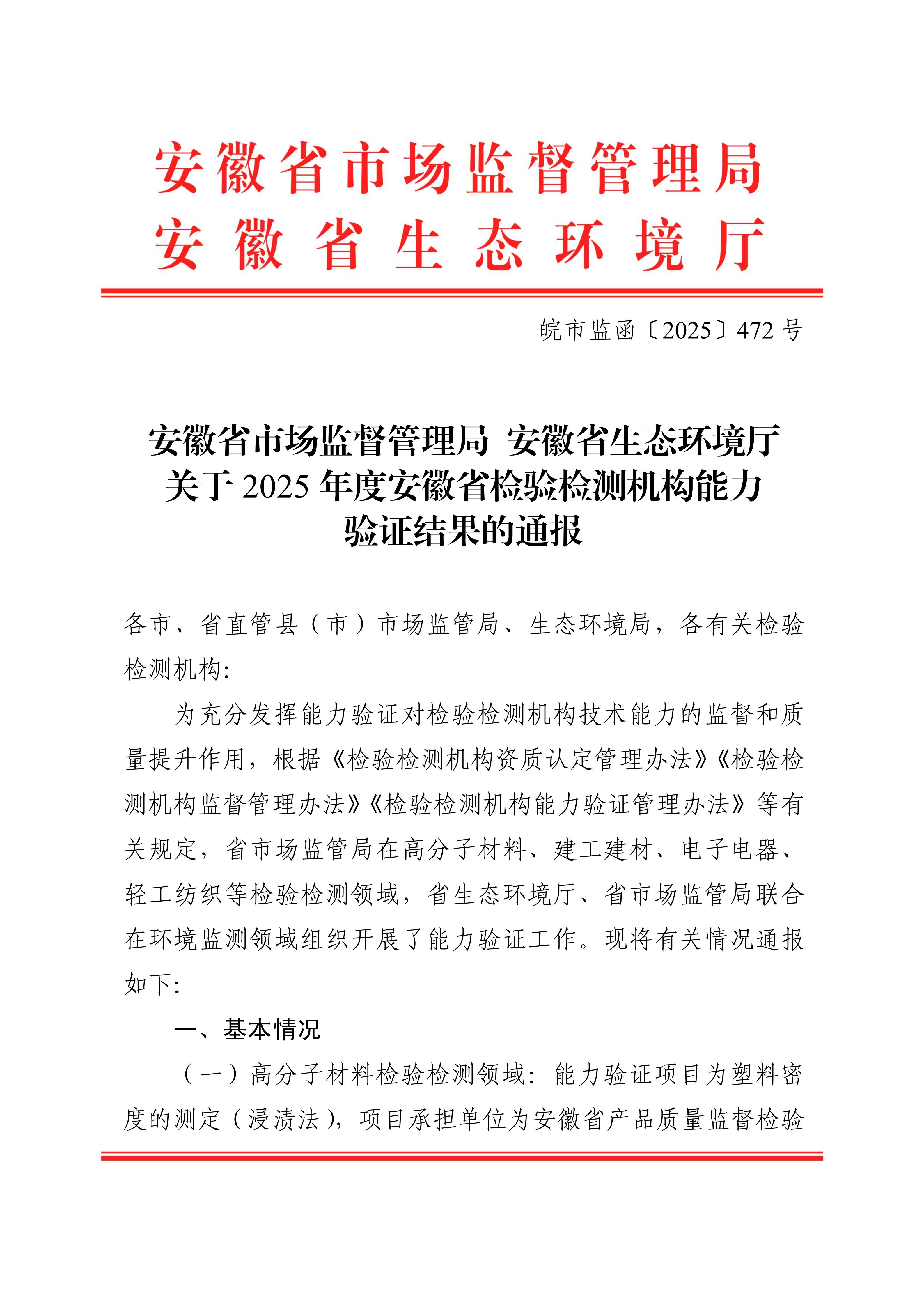 近日,安徽省市场监督管理局、安徽省生态环境厅联合发布了《2025年度安徽省检验检测机构能力验证结果的通报》。安徽寰宇工程质量检测有限公司在高分子材料、建工建材两个检验检测领域的能力验证中,均取得“合格”结果,充分展现了公司过硬的技术实力和可靠的质量管理能力。 ...