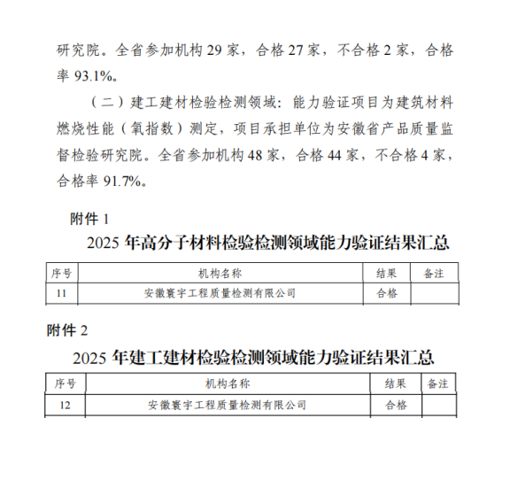 近日,安徽省市场监督管理局、安徽省生态环境厅联合发布了《2025年度安徽省检验检测机构能力验证结果的通报》。安徽寰宇工程质量检测有限公司在高分子材料、建工建材两个检验检测领域的能力验证中,均取得“合格”结果,充分展现了公司过硬的技术实力和可靠的质量管理能力。